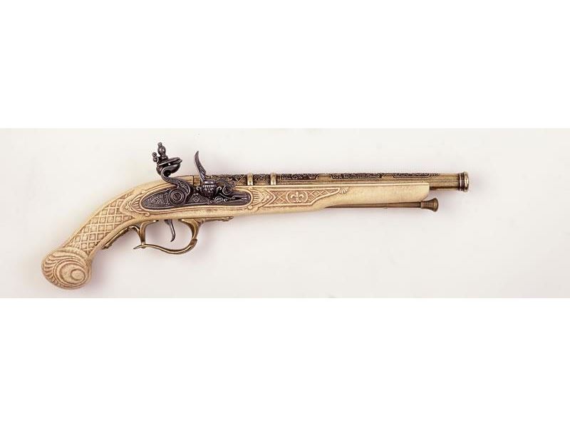 Unique looking flintlock pistol. Simulated ivory stock with cast metal brass finished barrel.